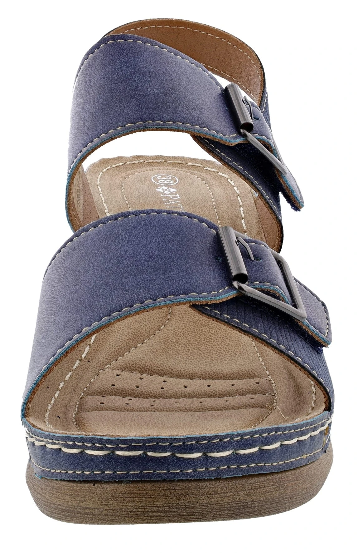Comfortable wedge sandal with a back strap and buckle hook and loop straps that go across for security of the foot all day long.