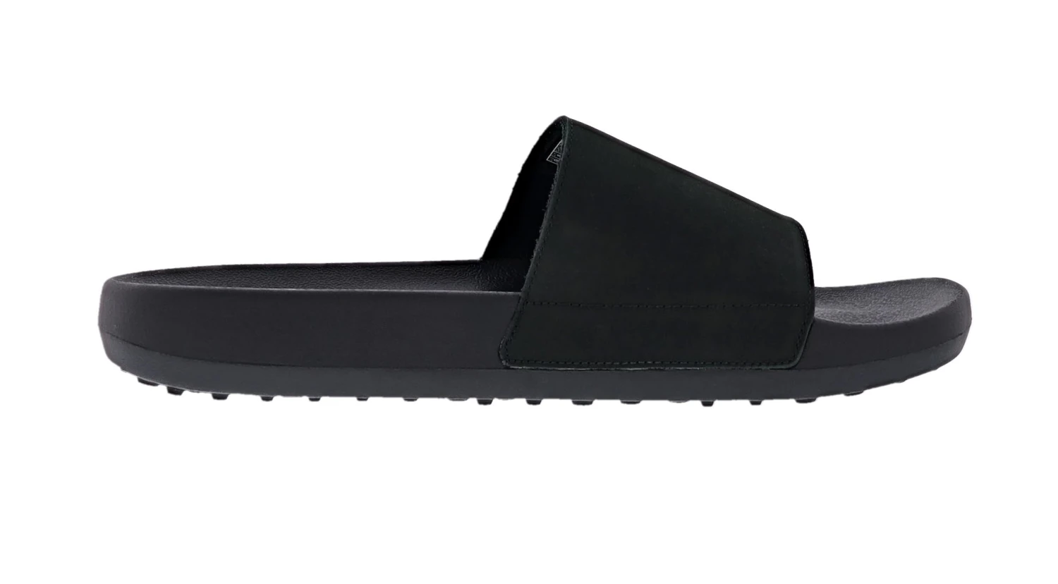 - Single strap slide sandal with leather upper